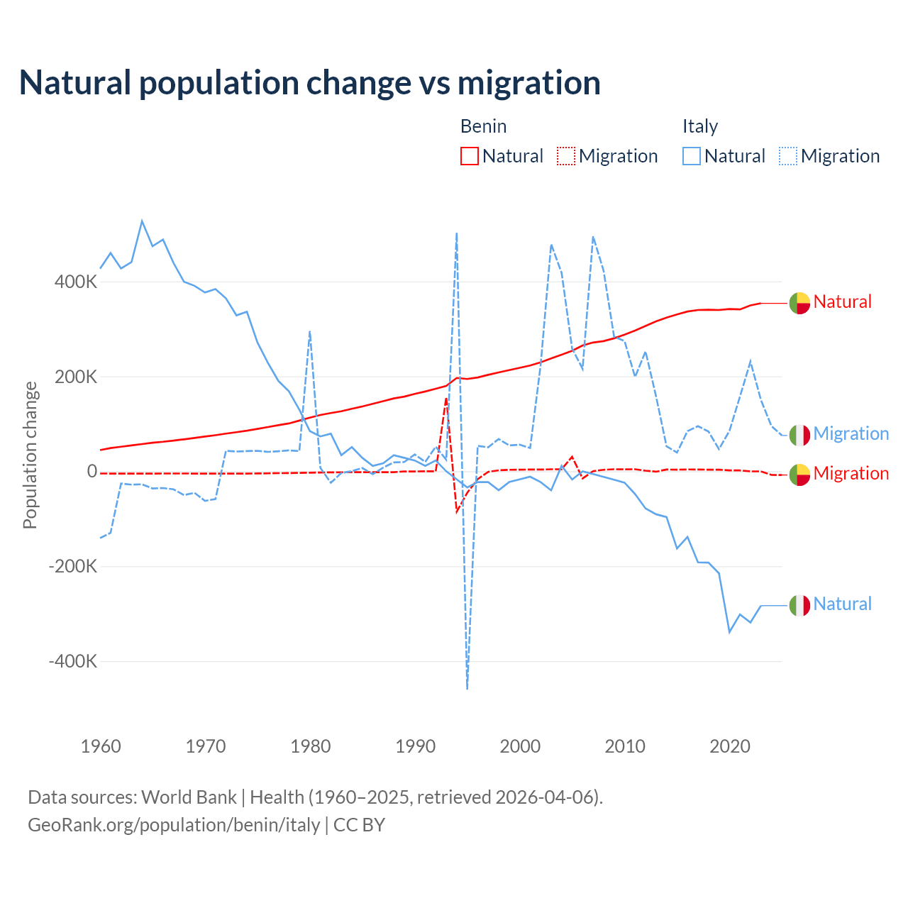 Over the last 10 years, 99.3% of the population change in Benin is from natural causes (a gain of 3,397,218 people) and 0.71% is from migration (a gain of 24,401 people). In Italy 68.6% is from natural causes (a loss of 2,239,084 people) and 31.4% is from migration (a gain of 1,026,128 people).