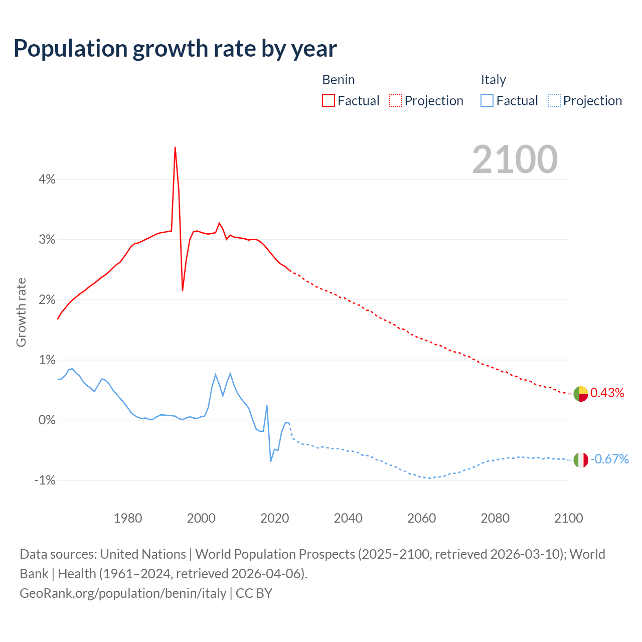 - For the last 10 years, Benin has had an average growth rate of +2.77% per year vs -0.21% in Italy.