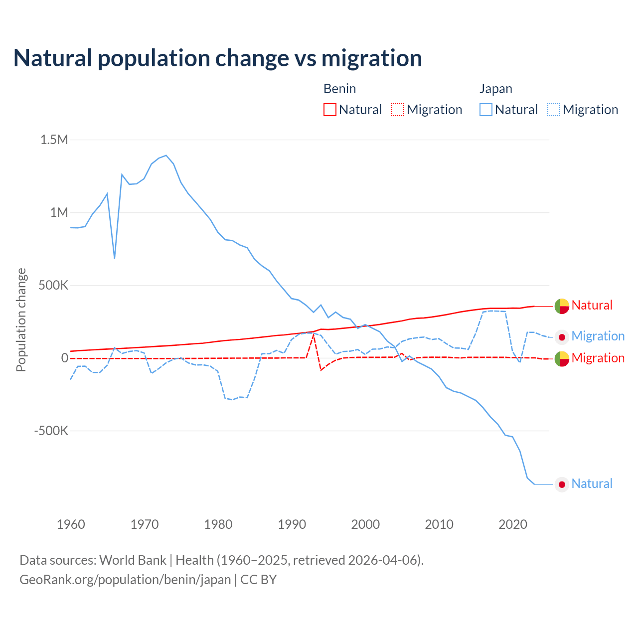 Over the last 10 years, 99.3% of the population change in Benin is from natural causes (a gain of 3,397,218 people) and 0.71% is from migration (a gain of 24,401 people). In Japan 73.6% is from natural causes (a loss of 5,178,838 people) and 26.4% is from migration (a gain of 1,860,103 people).