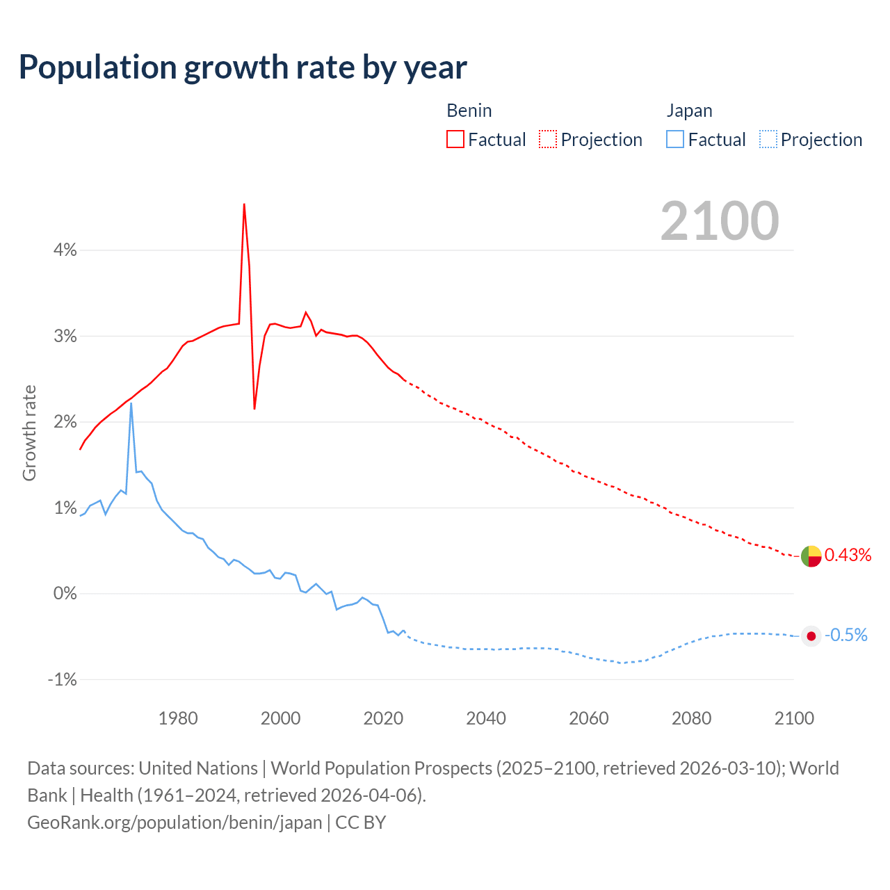 - For the last 10 years, Benin has had an average growth rate of +2.77% per year vs -0.25% in Japan.