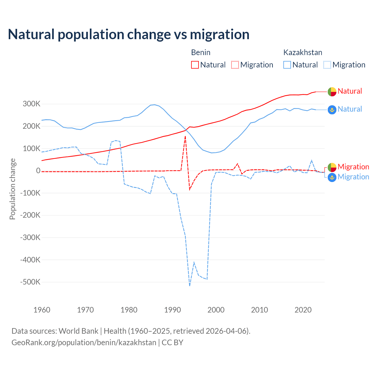 Over the last 10 years, 99.3% of the population change in Benin is from natural causes (a gain of 3,397,218 people) and 0.71% is from migration (a gain of 24,401 people). In Kazakhstan 98.7% is from natural causes (a gain of 2,743,094 people) and 1.33% is from migration (a gain of 36,908 people).