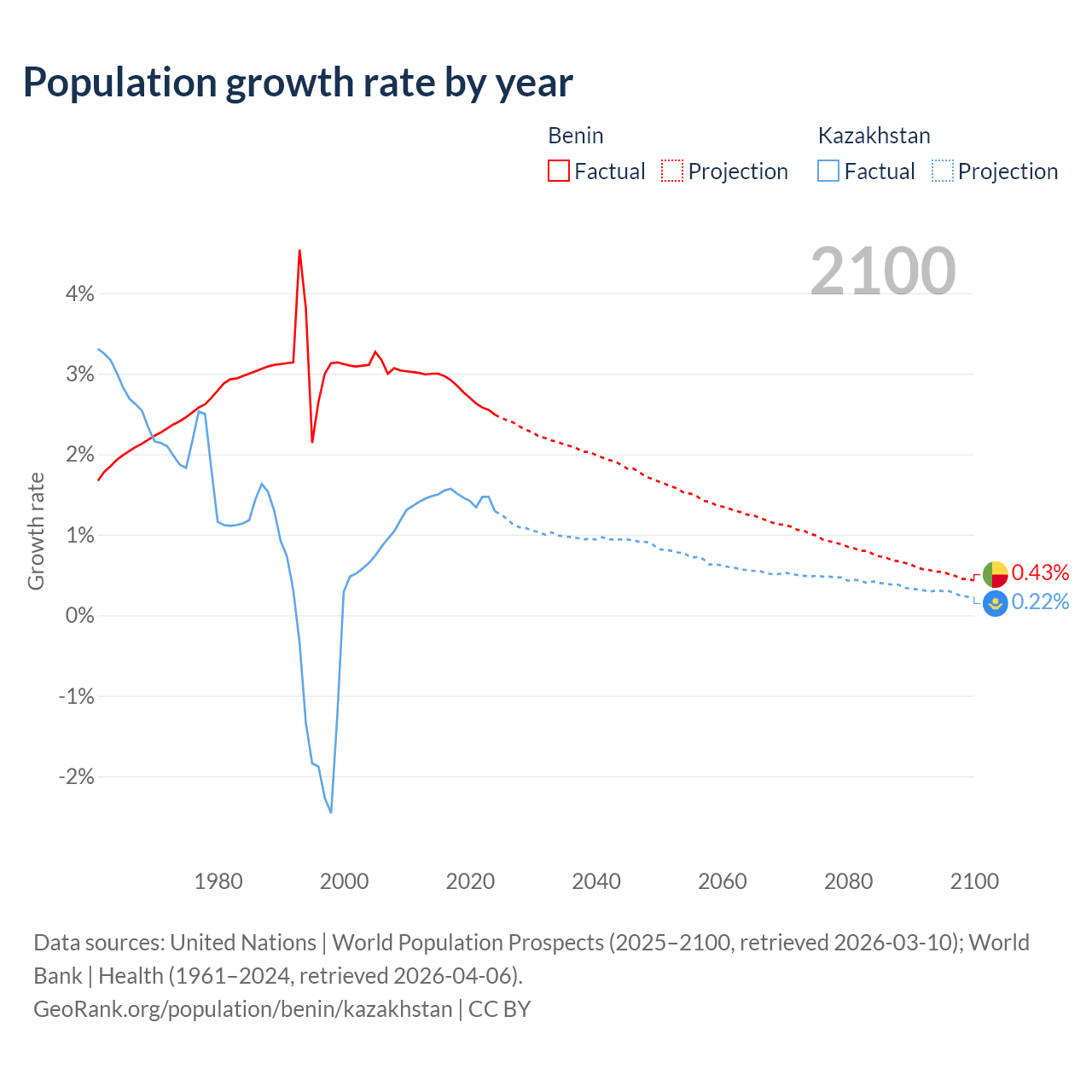 - For the last 10 years, Benin has had an average growth rate of +2.77% per year vs +1.46% in Kazakhstan.