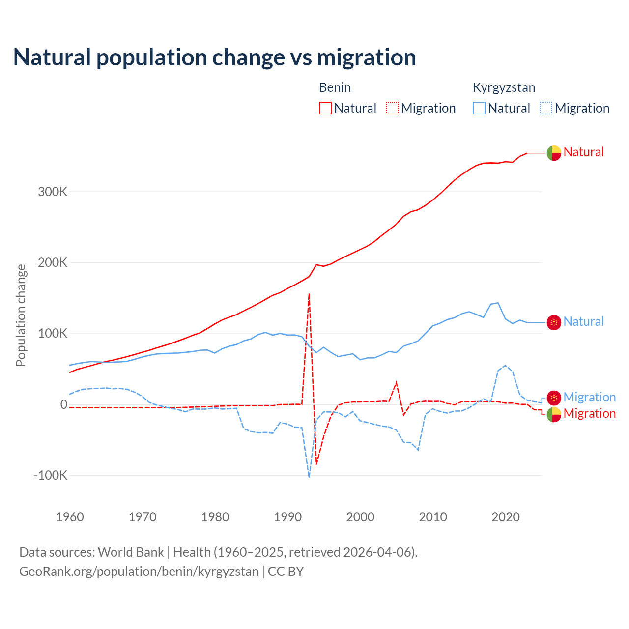 Over the last 10 years, 99.3% of the population change in Benin is from natural causes (a gain of 3,397,218 people) and 0.71% is from migration (a gain of 24,401 people). In Kyrgyzstan 88.5% is from natural causes (a gain of 1,258,837 people) and 11.5% is from migration (a gain of 164,132 people).