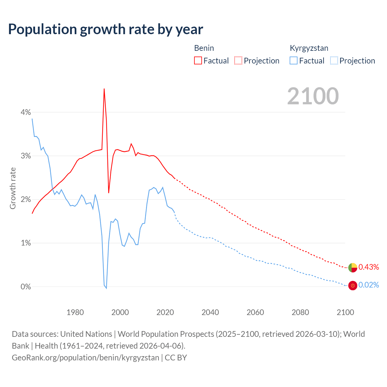 - For the last 10 years, Benin has had an average growth rate of +2.77% per year vs +2.05% in Kyrgyzstan.