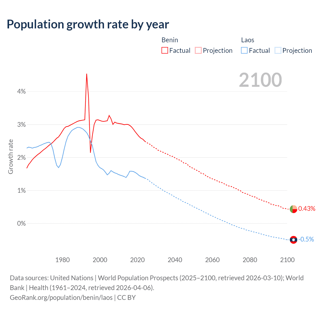- For the last 10 years, Benin has had an average growth rate of +2.77% per year vs +1.48% in Laos.
