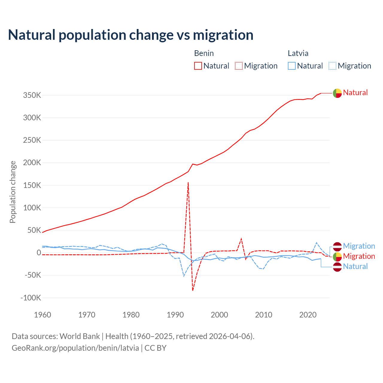 Over the last 10 years, 99.3% of the population change in Benin is from natural causes (a gain of 3,397,218 people) and 0.71% is from migration (a gain of 24,401 people). In Latvia 82.7% is from natural causes (a loss of 103,711 people) and 17.3% is from migration (a loss of 21,641 people).