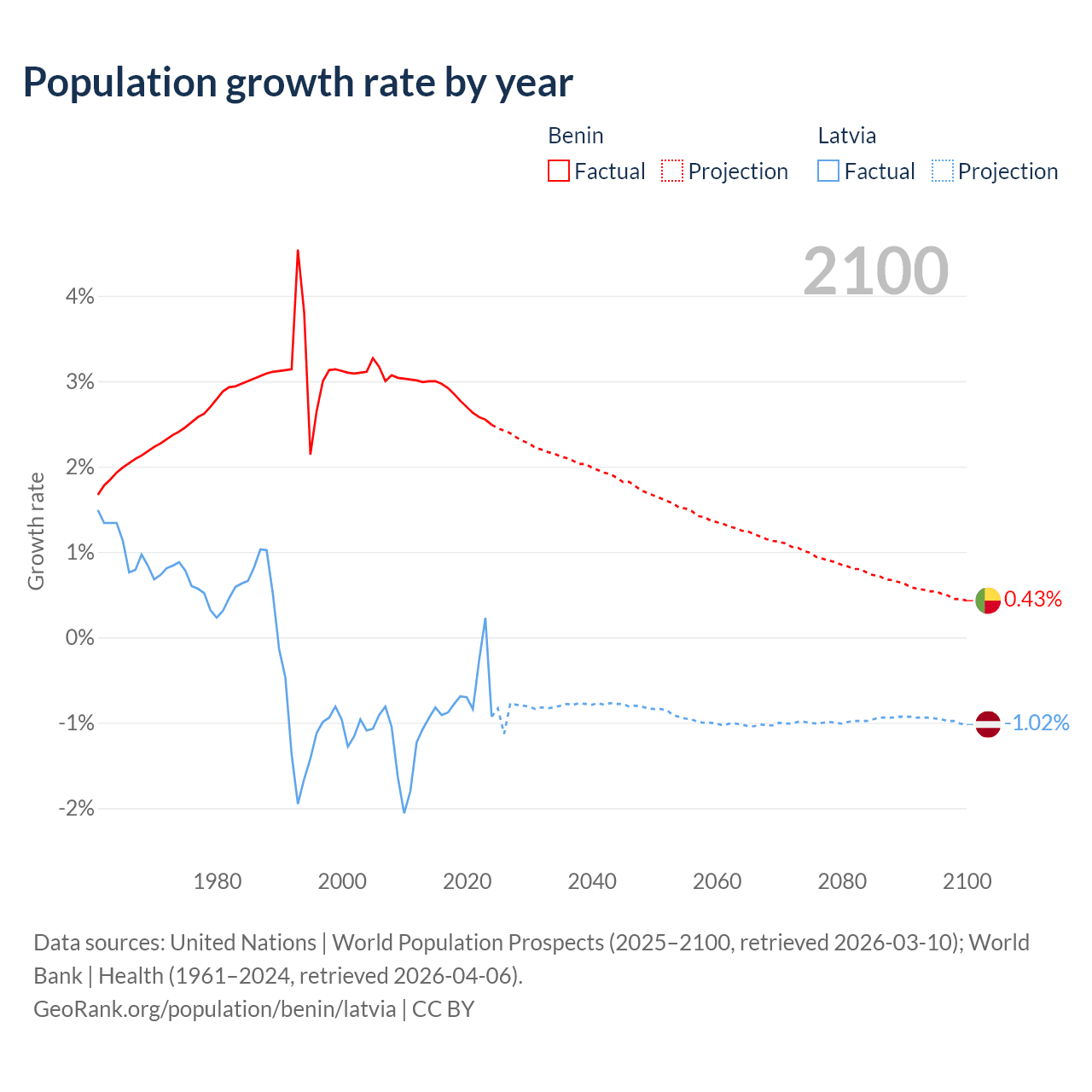- For the last 10 years, Benin has had an average growth rate of +2.77% per year vs -0.68% in Latvia.