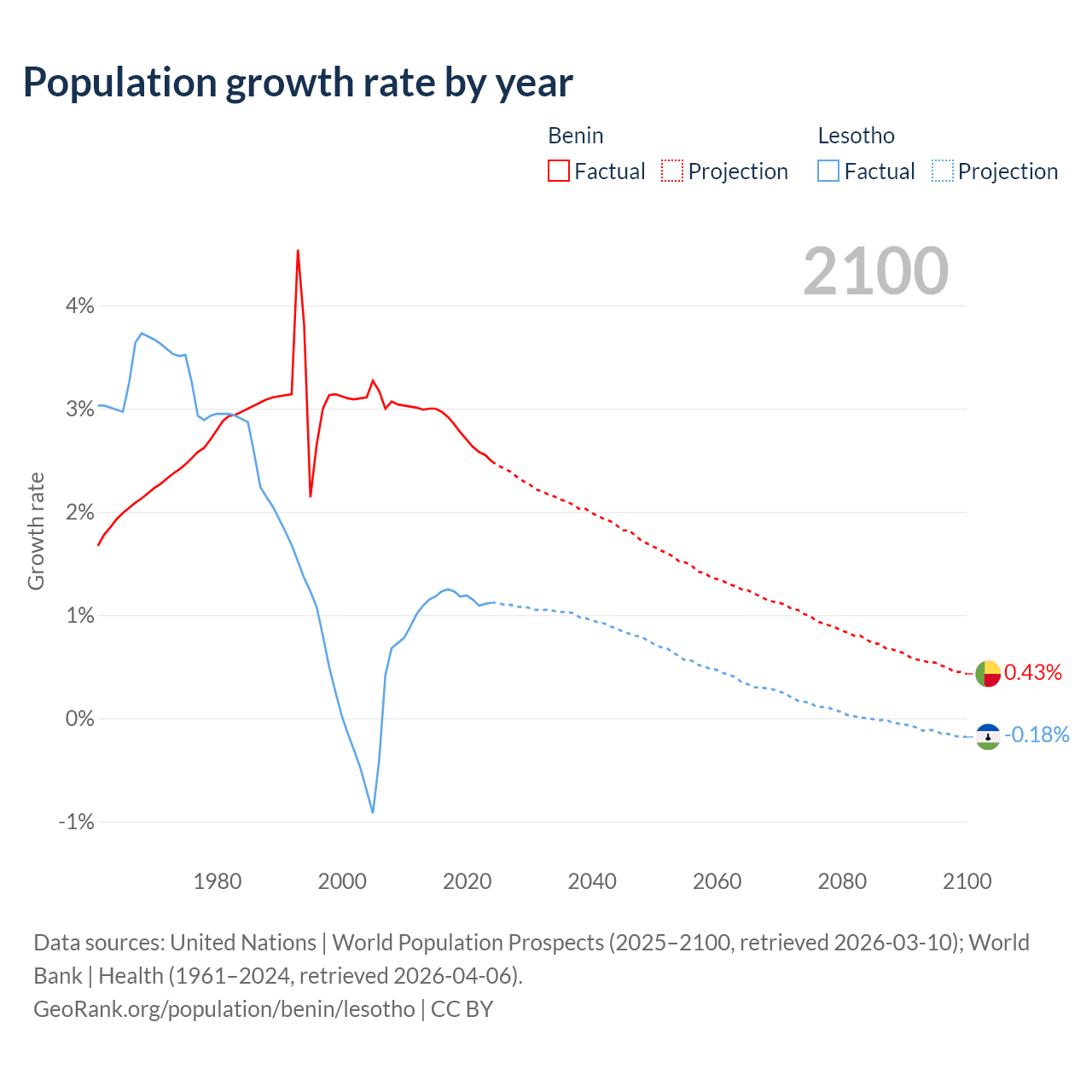 - For the last 10 years, Benin has had an average growth rate of +2.77% per year vs +1.17% in Lesotho.