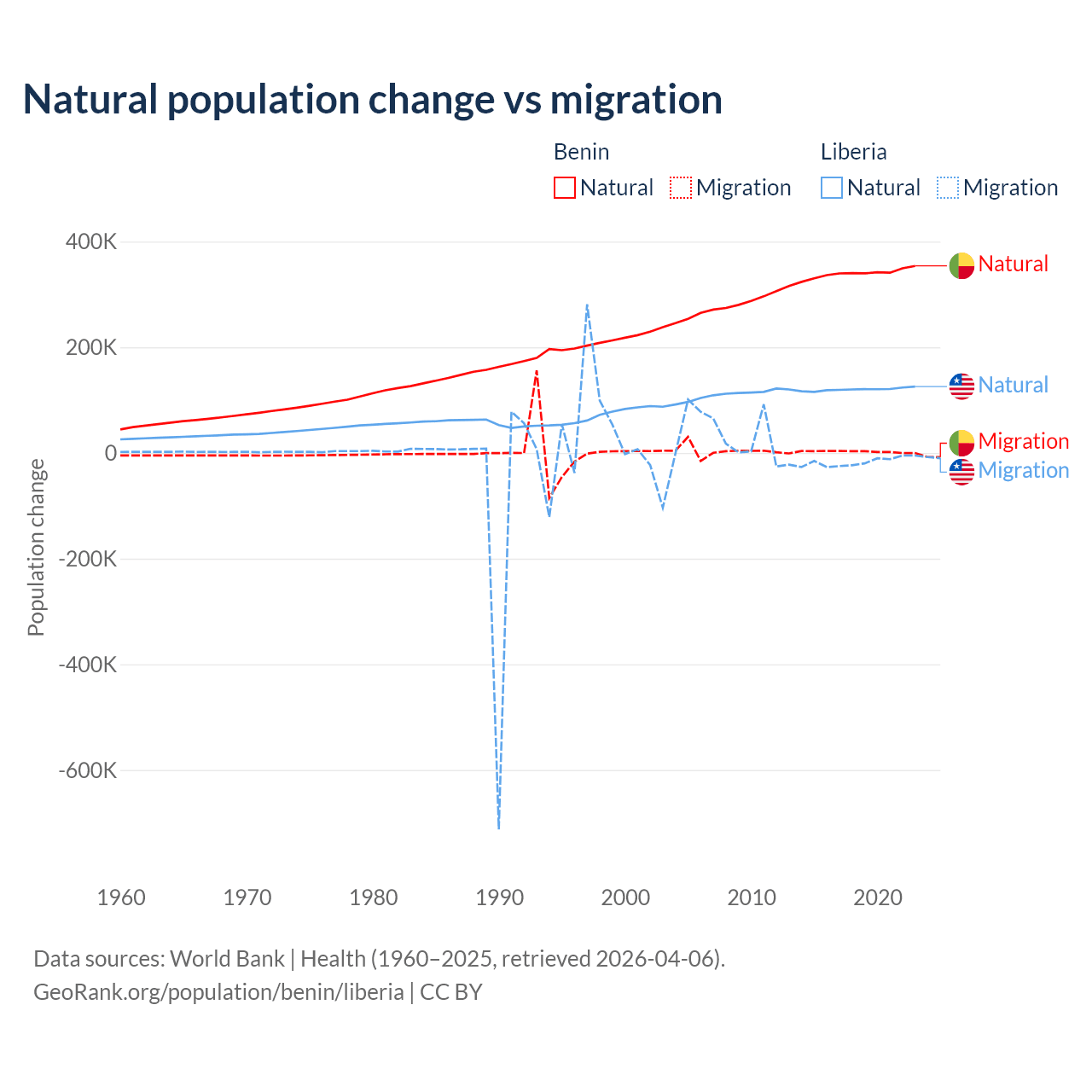 Over the last 10 years, 99.3% of the population change in Benin is from natural causes (a gain of 3,397,218 people) and 0.71% is from migration (a gain of 24,401 people). In Liberia 87.7% is from natural causes (a gain of 1,202,387 people) and 12.3% is from migration (a loss of 168,316 people).