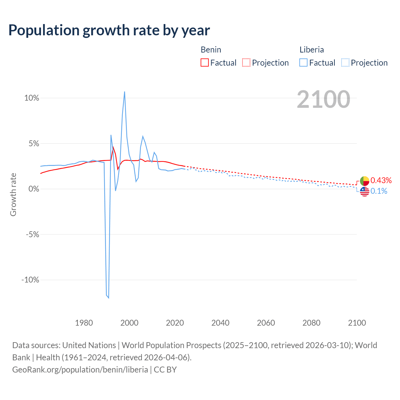 - For the last 10 years, Benin has had an average growth rate of +2.77% per year vs +2.09% in Liberia.
