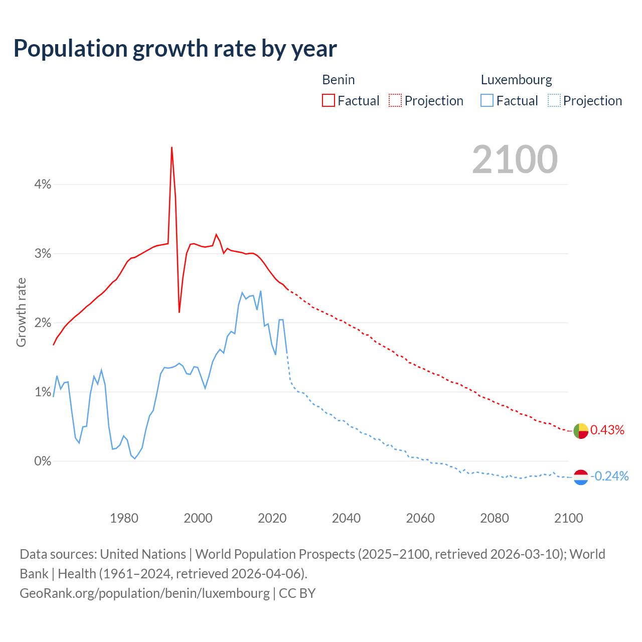 - For the last 10 years, Benin has had an average growth rate of +2.77% per year vs +2.02% in Luxembourg.