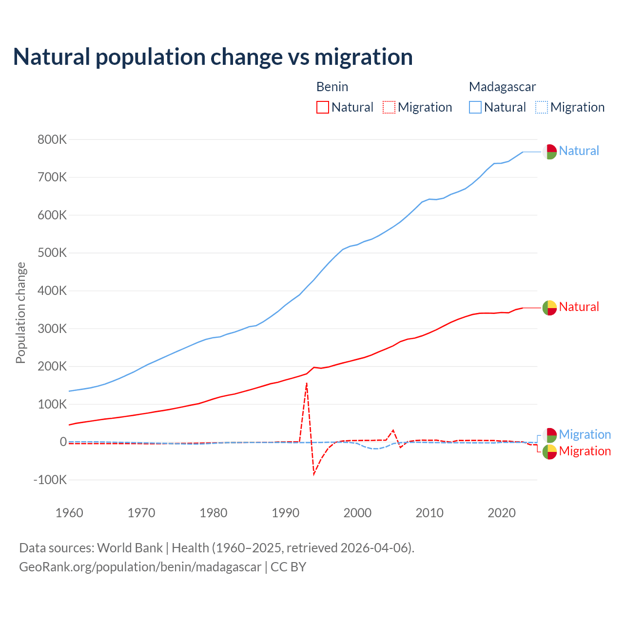 Over the last 10 years, 99.3% of the population change in Benin is from natural causes (a gain of 3,397,218 people) and 0.71% is from migration (a gain of 24,401 people). In Madagascar 99.7% is from natural causes (a gain of 7,165,578 people) and 0.31% is from migration (a loss of 22,384 people).