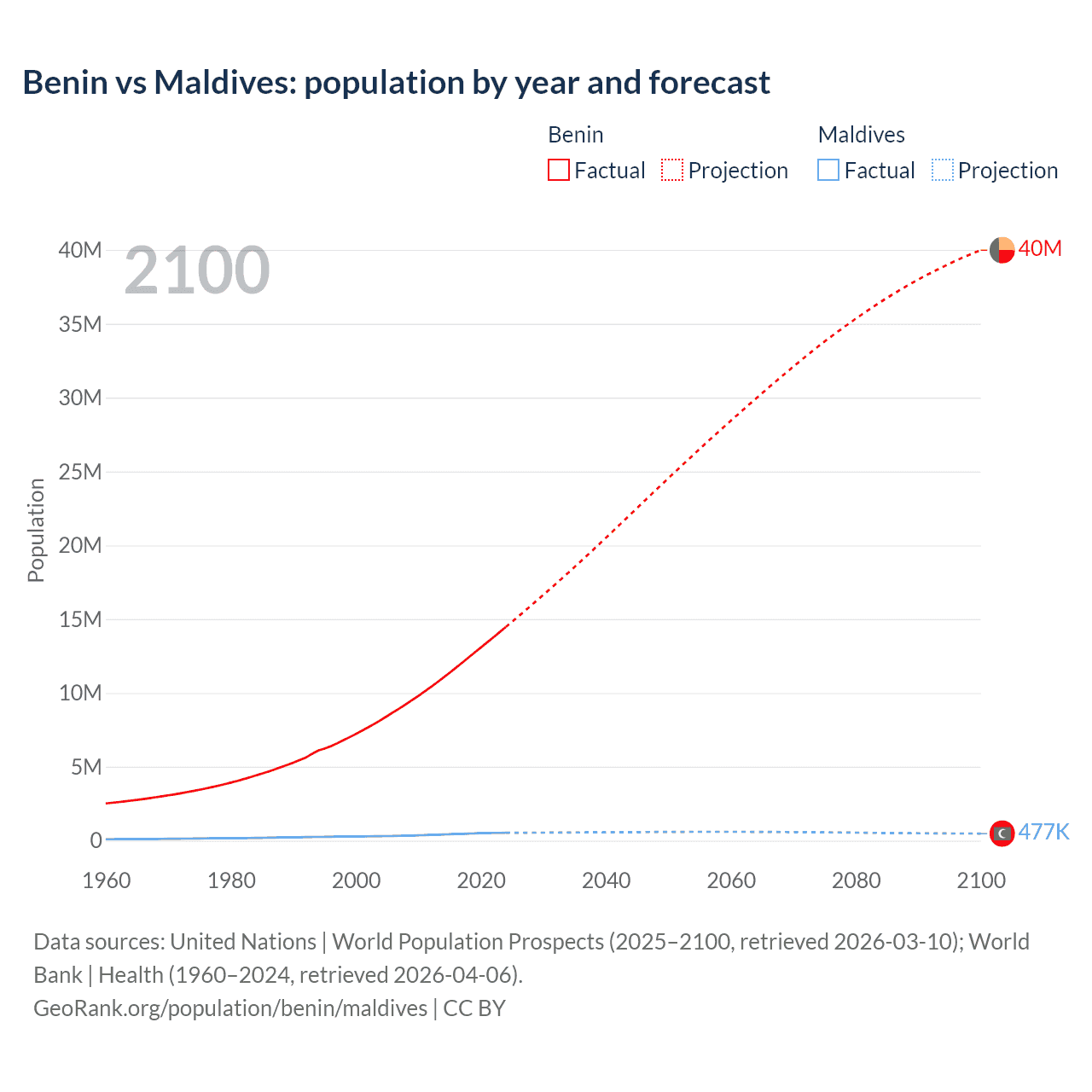 Benin vs Maldives: population by year and forecast