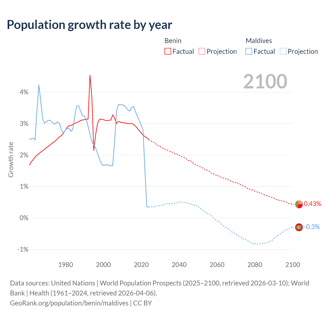- For the last 10 years, Benin has had an average growth rate of +2.77% per year vs +2.56% in Maldives.