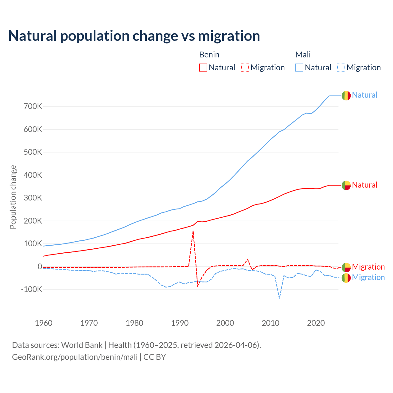 Over the last 10 years, 99.3% of the population change in Benin is from natural causes (a gain of 3,397,218 people) and 0.71% is from migration (a gain of 24,401 people). In Mali 94.9% is from natural causes (a gain of 6,749,473 people) and 5.13% is from migration (a loss of 365,292 people).