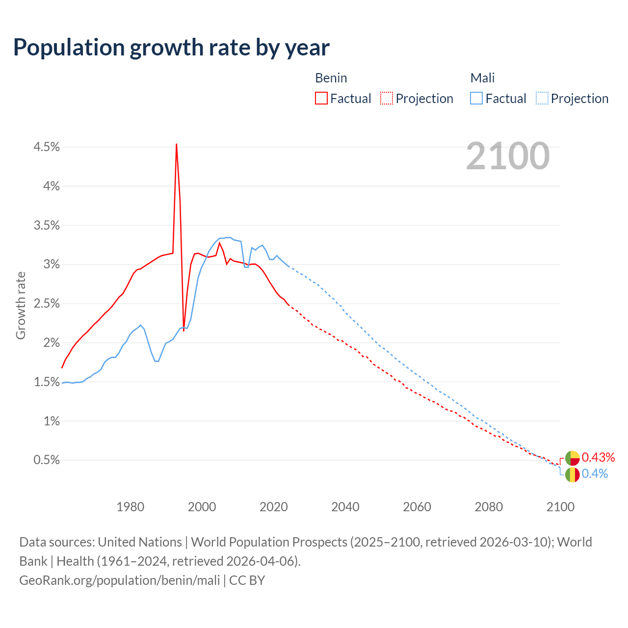- For the last 10 years, Benin has had an average growth rate of +2.77% per year vs +3.12% in Mali.