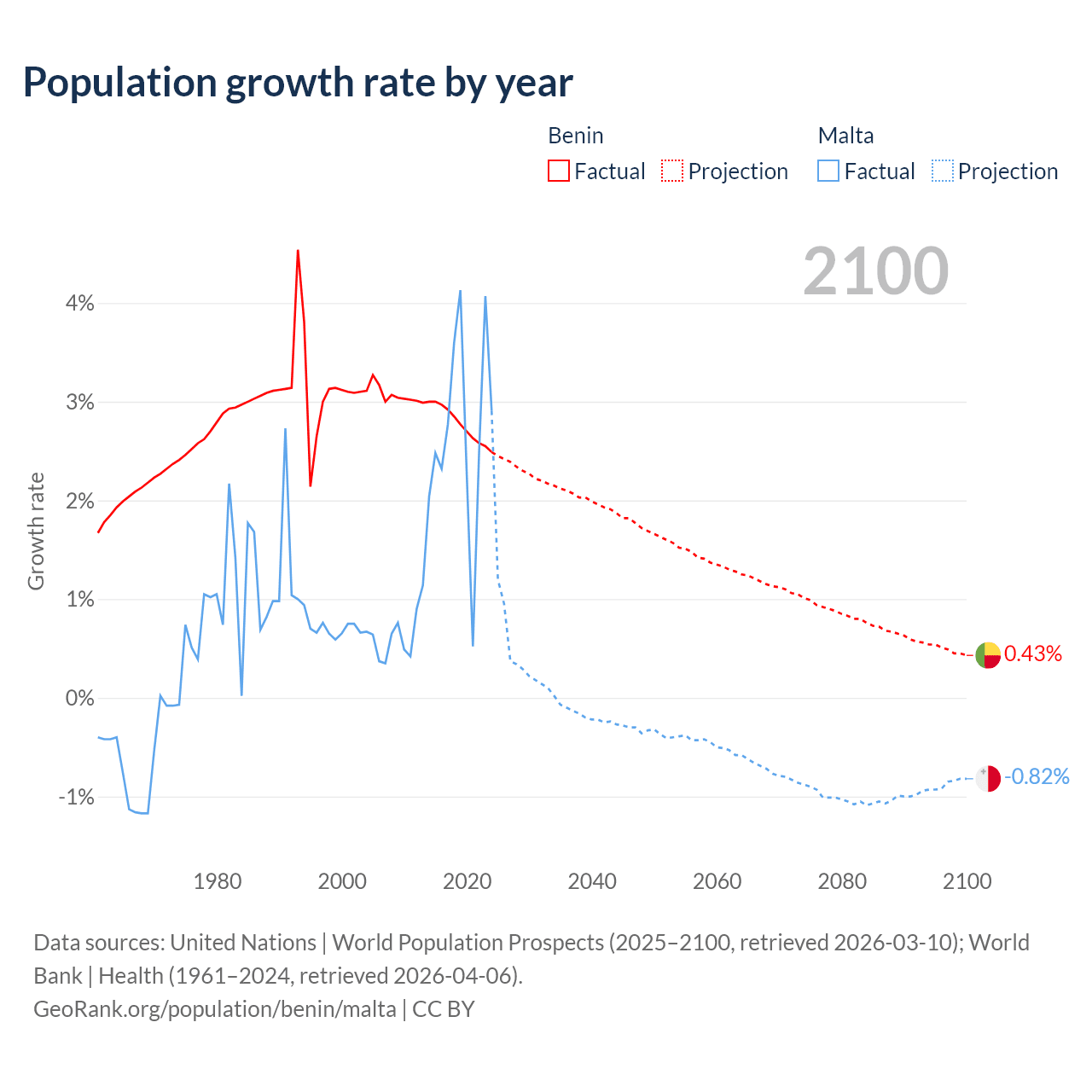 - For the last 10 years, Benin has had an average growth rate of +2.77% per year vs +2.69% in Malta.