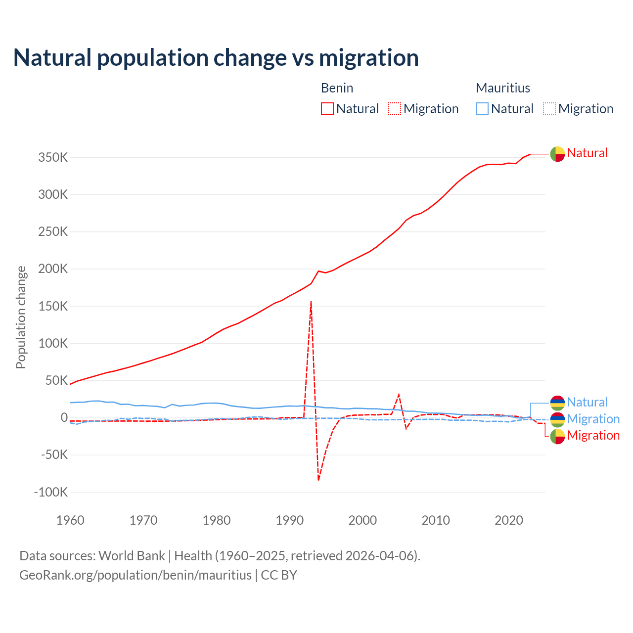 Over the last 10 years, 99.3% of the population change in Benin is from natural causes (a gain of 3,397,218 people) and 0.71% is from migration (a gain of 24,401 people). In Mauritius 30.9% is from natural causes (a gain of 19,327 people) and 69.1% is from migration (a loss of 43,294 people).