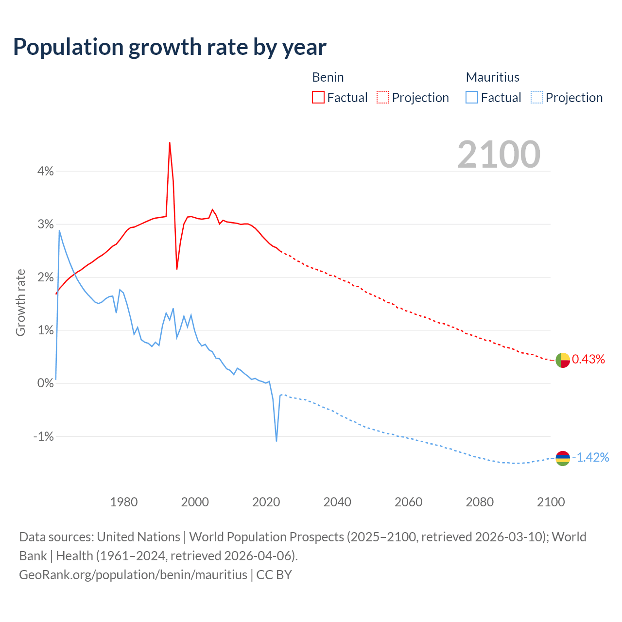 - For the last 10 years, Benin has had an average growth rate of +2.77% per year vs -0.09% in Mauritius.