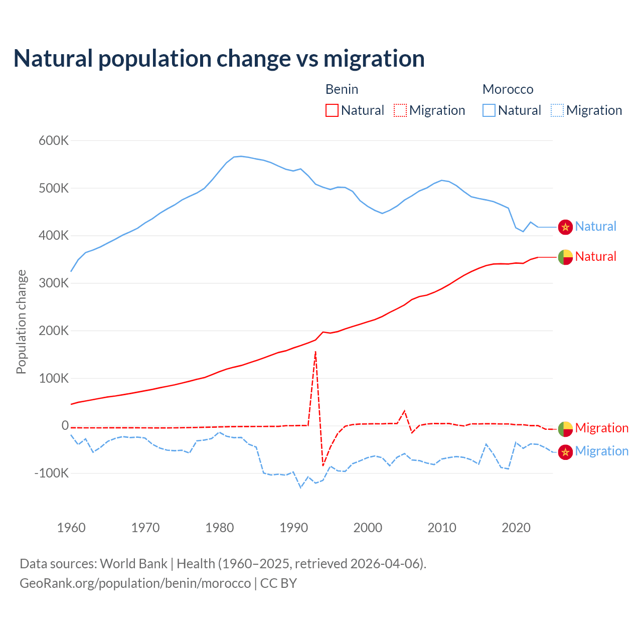 Over the last 10 years, 99.3% of the population change in Benin is from natural causes (a gain of 3,397,218 people) and 0.71% is from migration (a gain of 24,401 people). In Morocco 88.3% is from natural causes (a gain of 4,495,223 people) and 11.7% is from migration (a loss of 594,083 people).
