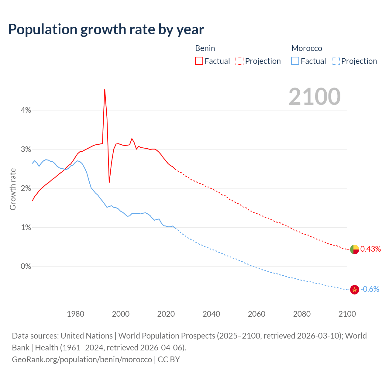 - For the last 10 years, Benin has had an average growth rate of +2.77% per year vs +1.09% in Morocco.