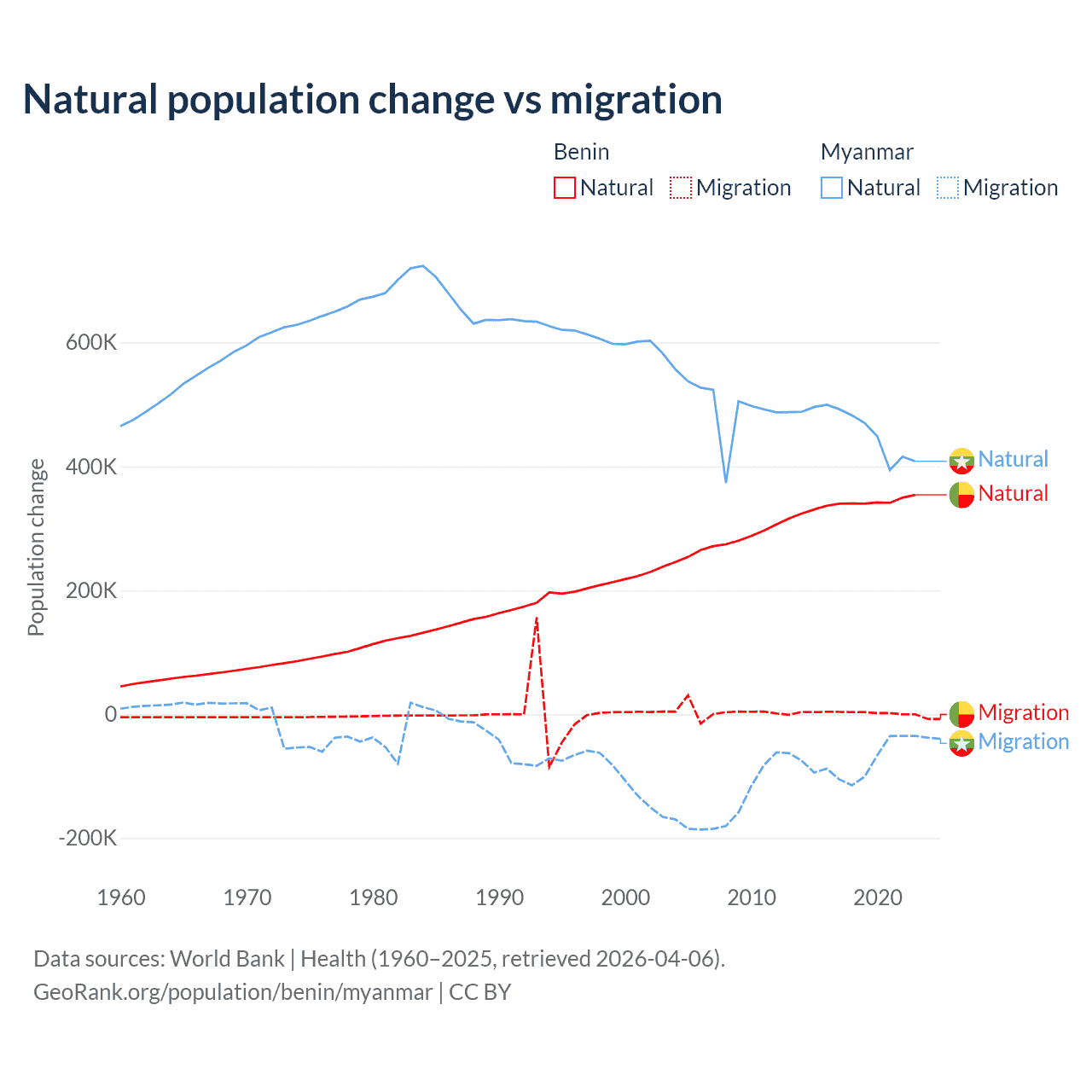 Over the last 10 years, 99.3% of the population change in Benin is from natural causes (a gain of 3,397,218 people) and 0.71% is from migration (a gain of 24,401 people). In Myanmar 86% is from natural causes (a gain of 4,594,615 people) and 14% is from migration (a loss of 749,272 people).