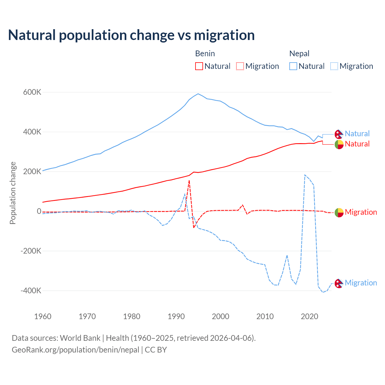 Over the last 10 years, 99.3% of the population change in Benin is from natural causes (a gain of 3,397,218 people) and 0.71% is from migration (a gain of 24,401 people). In Nepal 67.9% is from natural causes (a gain of 3,909,749 people) and 32.1% is from migration (a loss of 1,851,664 people).
