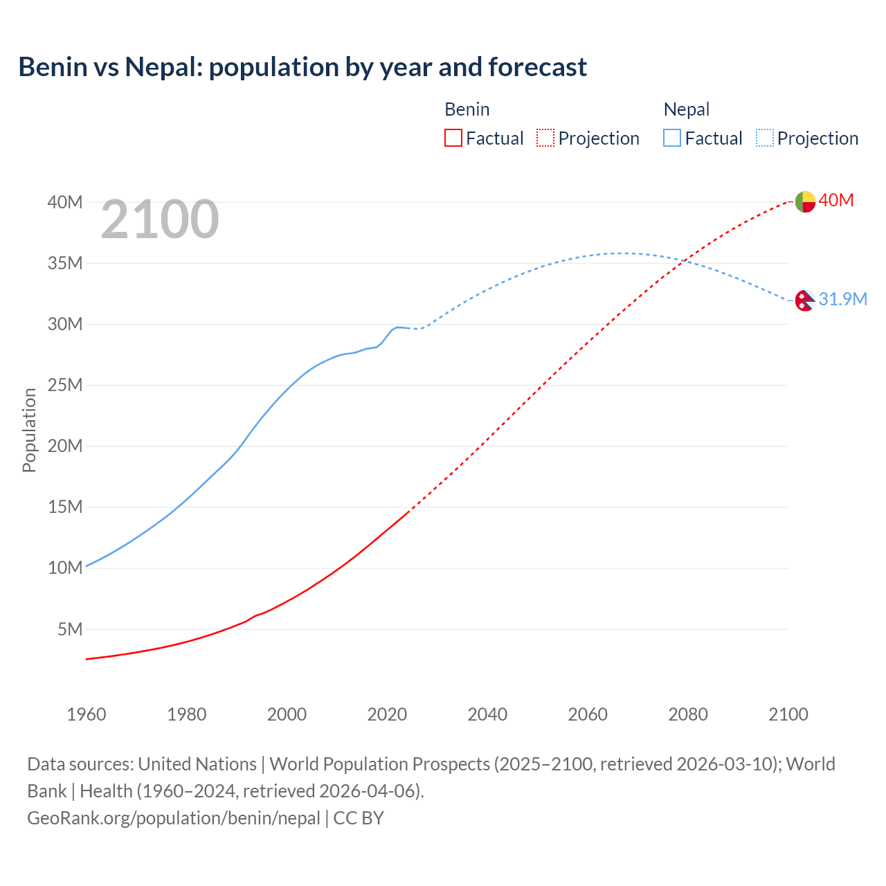 Benin vs Nepal: population by year and forecast
