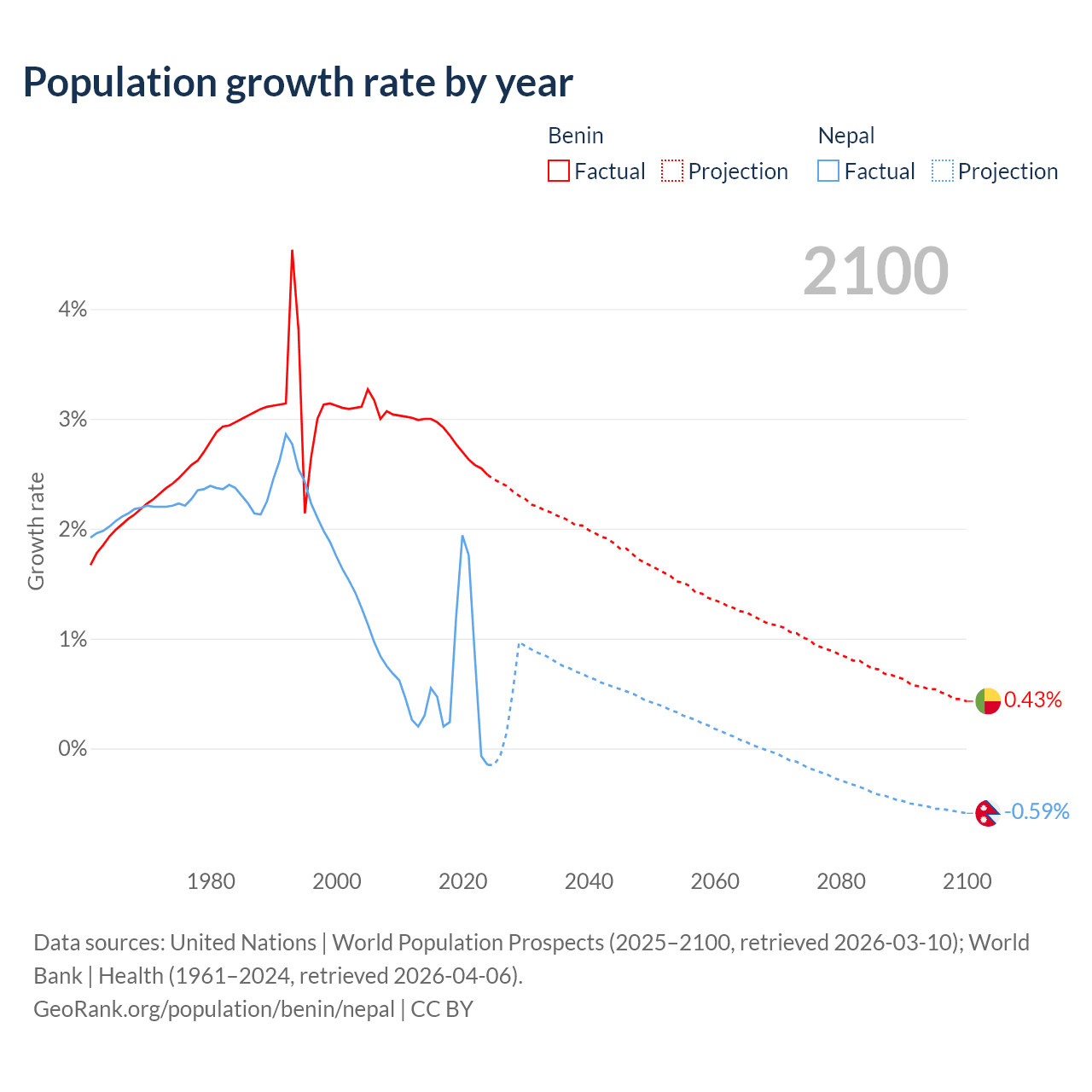 - For the last 10 years, Benin has had an average growth rate of +2.77% per year vs +0.66% in Nepal.