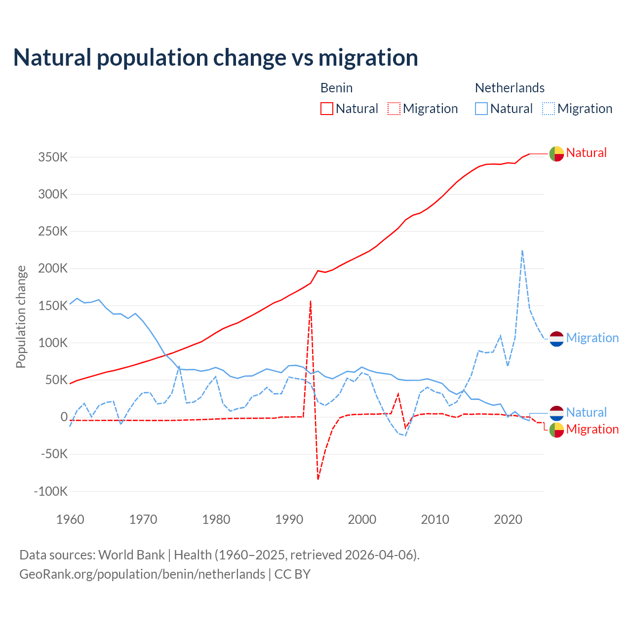 Over the last 10 years, 99.3% of the population change in Benin is from natural causes (a gain of 3,397,218 people) and 0.71% is from migration (a gain of 24,401 people). In the Netherlands 11.8% is from natural causes (a gain of 134,554 people) and 88.2% is from migration (a gain of 1,006,495 people).
