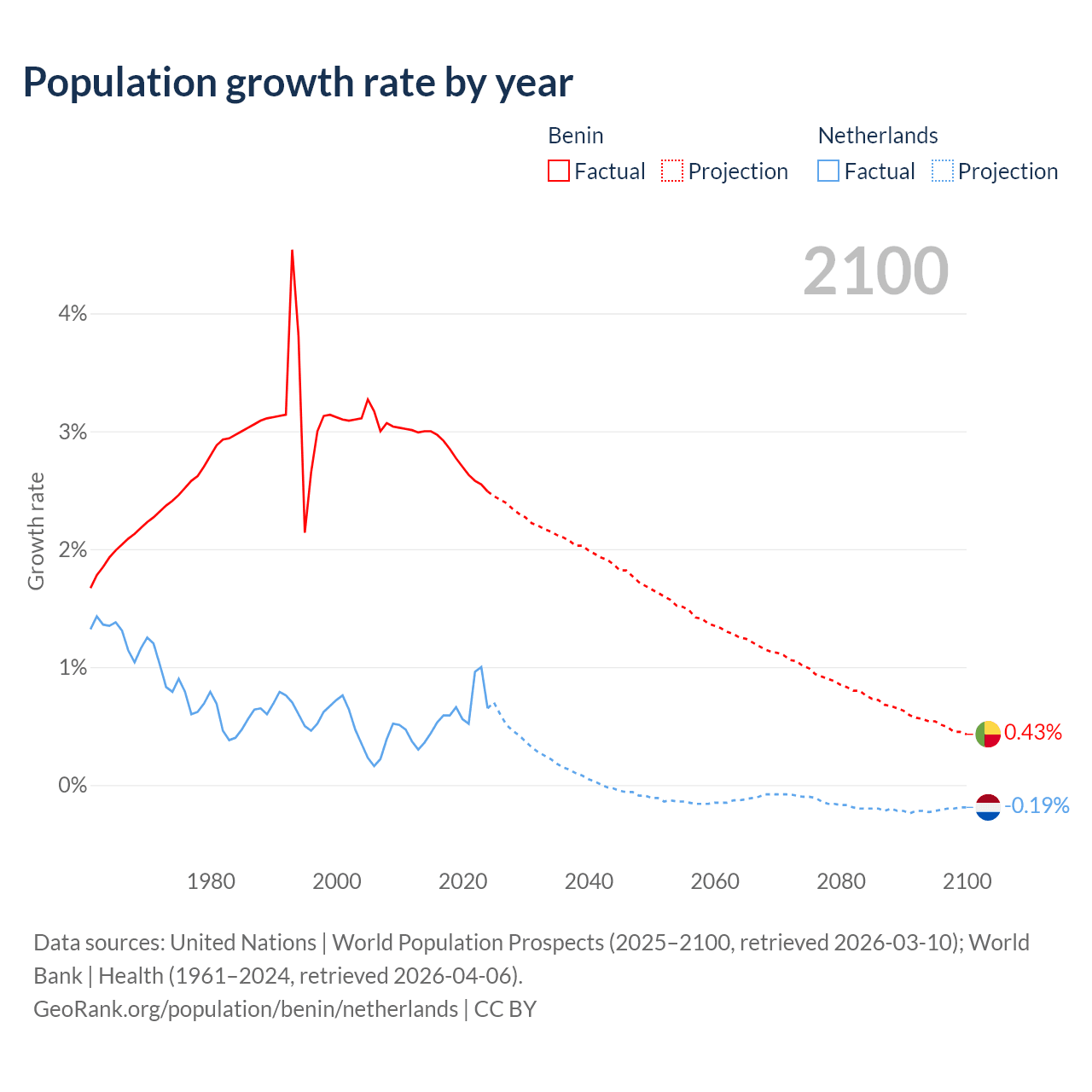 - For the last 10 years, Benin has had an average growth rate of +2.77% per year vs +0.62% in the Netherlands.