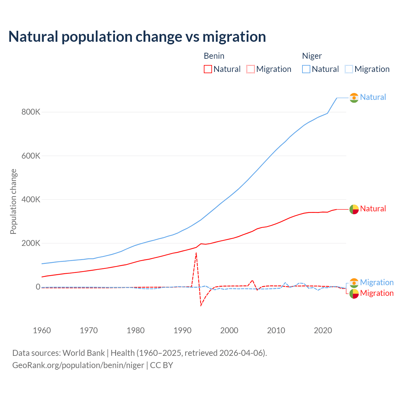 Over the last 10 years, 99.3% of the population change in Benin is from natural causes (a gain of 3,397,218 people) and 0.71% is from migration (a gain of 24,401 people). In Niger 100% is from natural causes (a gain of 7,728,287 people) and 0.03% is from migration (a gain of 2,520 people).