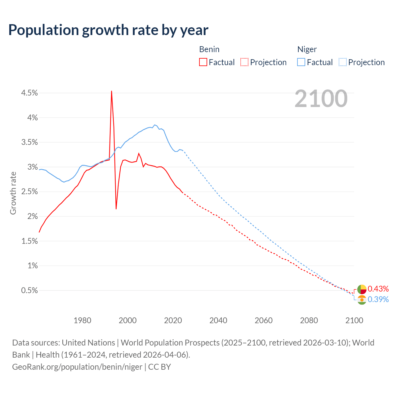 - For the last 10 years, Benin has had an average growth rate of +2.77% per year vs +3.5% in Niger.