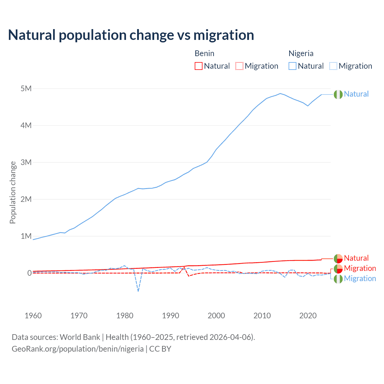 Over the last 10 years, 99.3% of the population change in Benin is from natural causes (a gain of 3,397,218 people) and 0.71% is from migration (a gain of 24,401 people). In Nigeria 99.2% is from natural causes (a gain of 47,163,517 people) and 0.77% is from migration (a loss of 368,103 people).