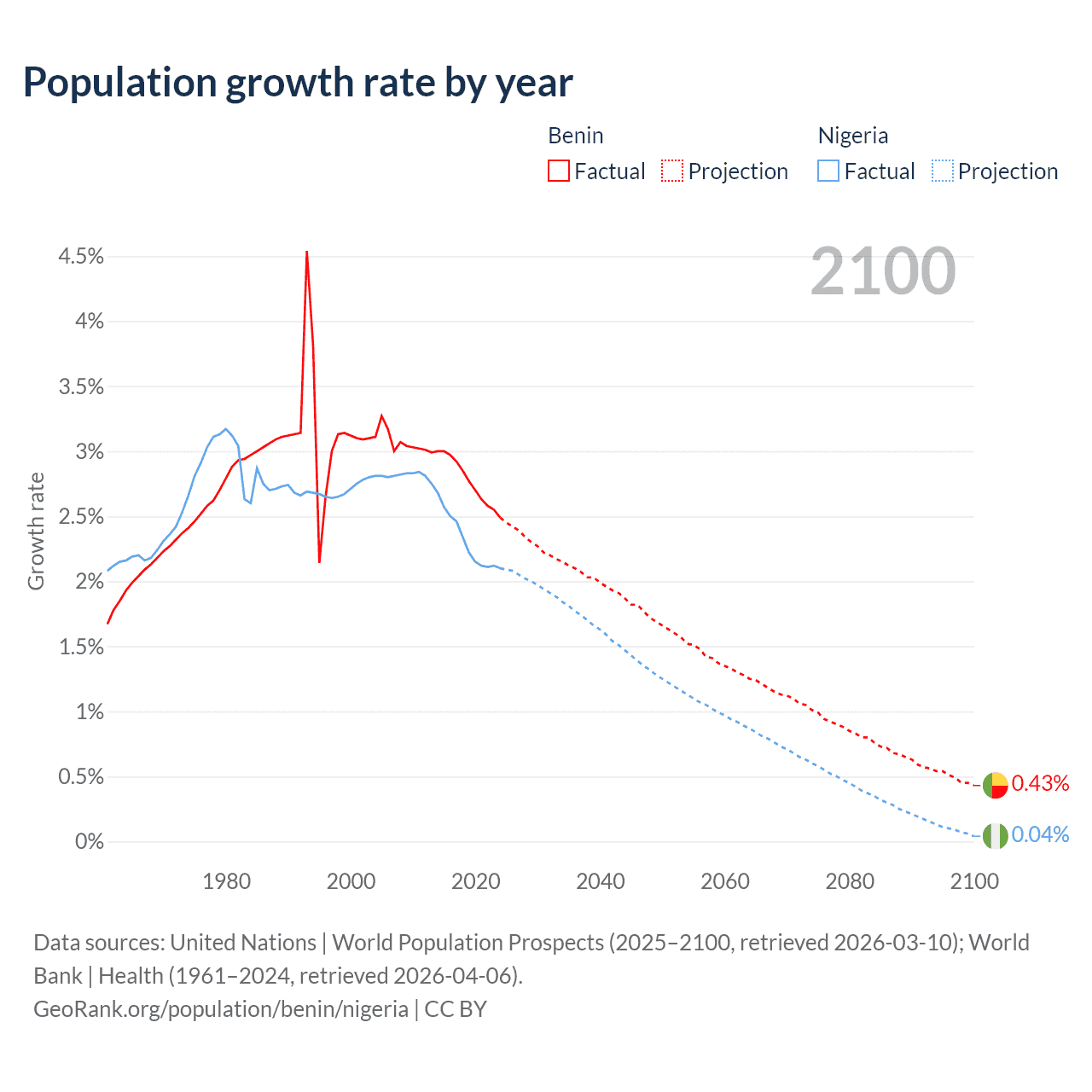 - For the last 10 years, Benin has had an average growth rate of +2.77% per year vs +2.31% in Nigeria.
