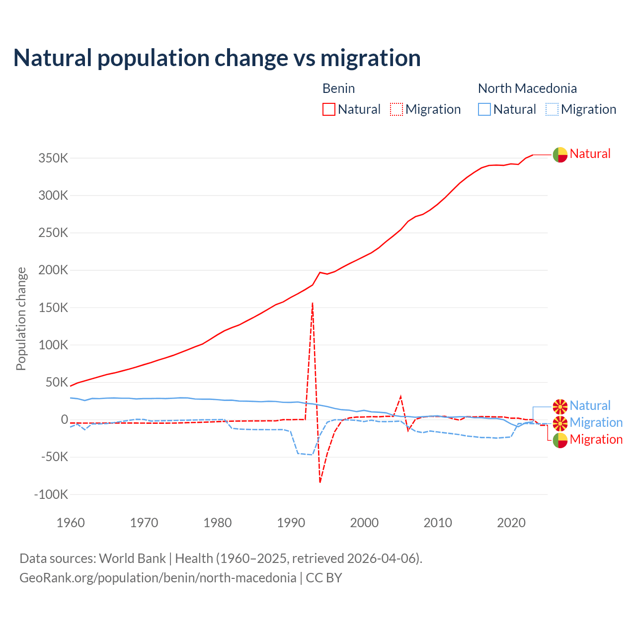 Over the last 10 years, 99.3% of the population change in Benin is from natural causes (a gain of 3,397,218 people) and 0.71% is from migration (a gain of 24,401 people). In North Macedonia 6.45% is from natural causes (a loss of 12,585 people) and 93.5% is from migration (a loss of 182,429 people).