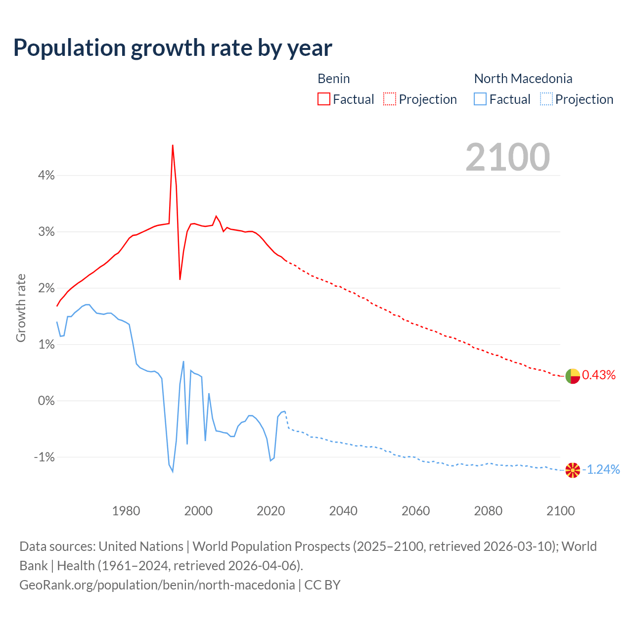 - For the last 10 years, Benin has had an average growth rate of +2.77% per year vs -0.48% in North Macedonia.