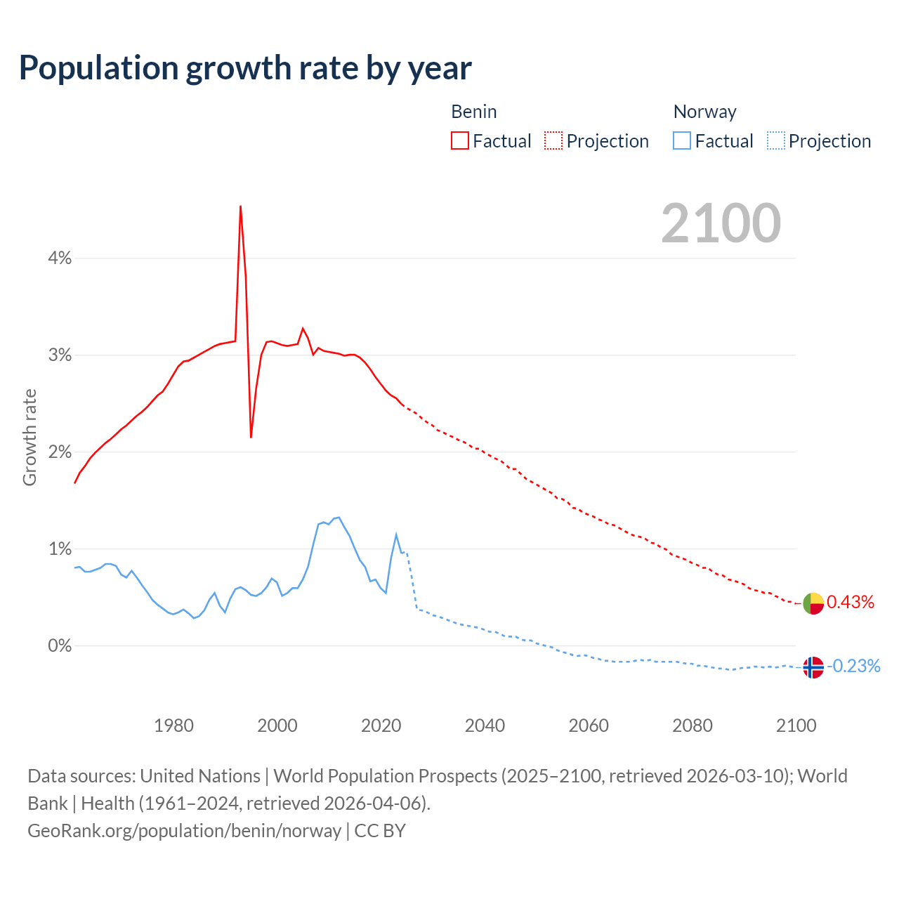 - For the last 10 years, Benin has had an average growth rate of +2.77% per year vs +0.85% in Norway.
