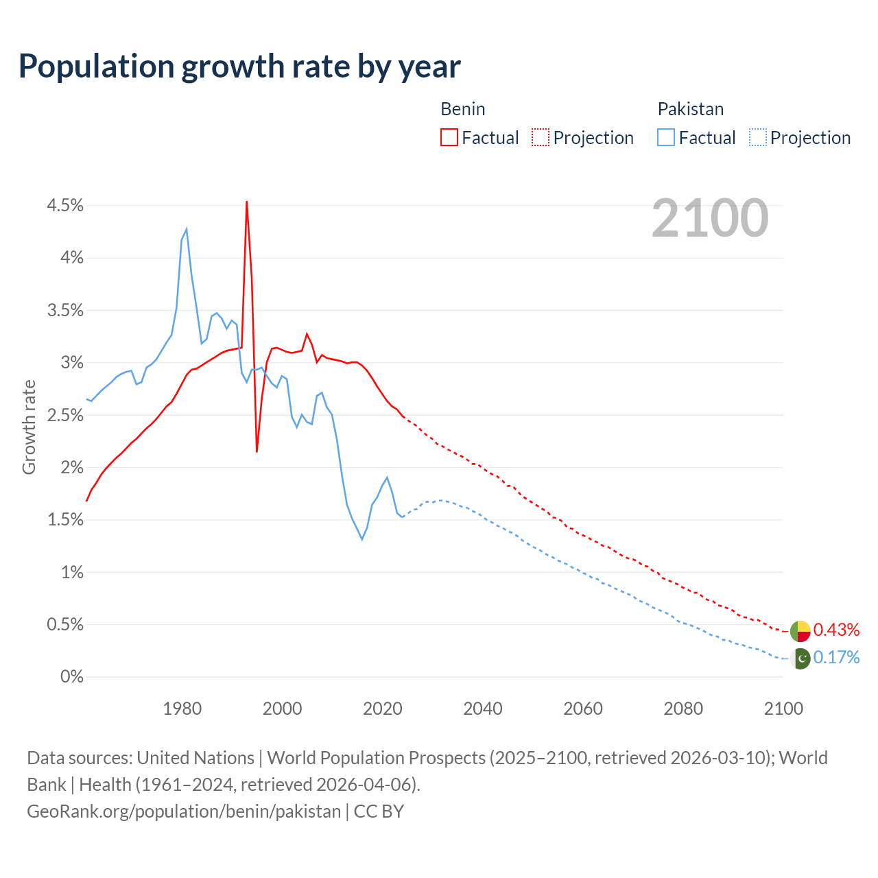 - For the last 10 years, Benin has had an average growth rate of +2.77% per year vs +1.6% in Pakistan.