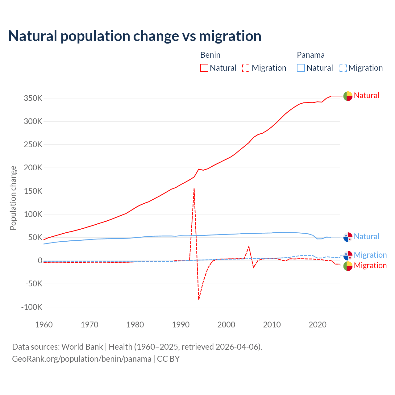 Over the last 10 years, 99.3% of the population change in Benin is from natural causes (a gain of 3,397,218 people) and 0.71% is from migration (a gain of 24,401 people). In Panama 86.5% is from natural causes (a gain of 544,211 people) and 13.5% is from migration (a gain of 84,849 people).