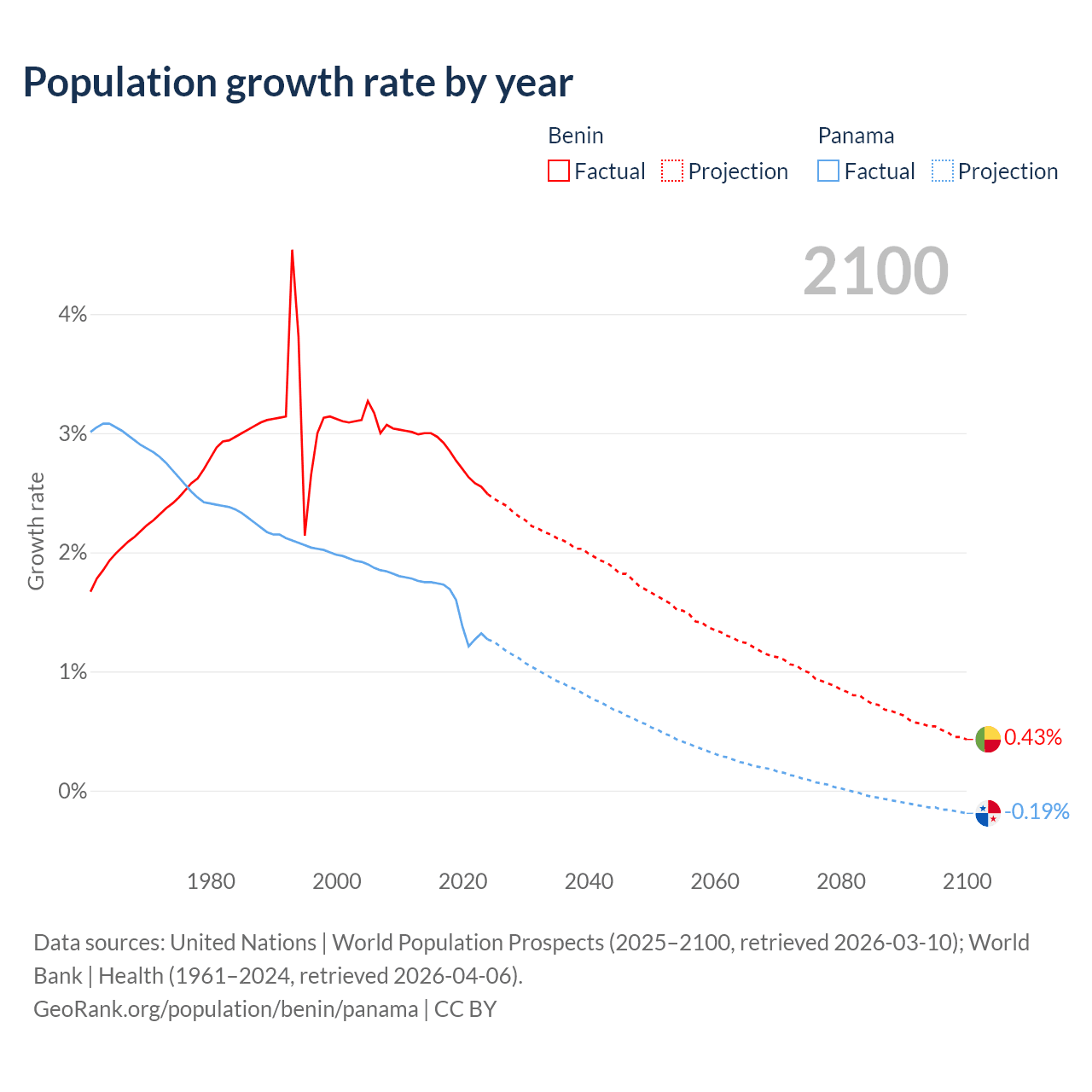 - For the last 10 years, Benin has had an average growth rate of +2.77% per year vs +1.52% in Panama.