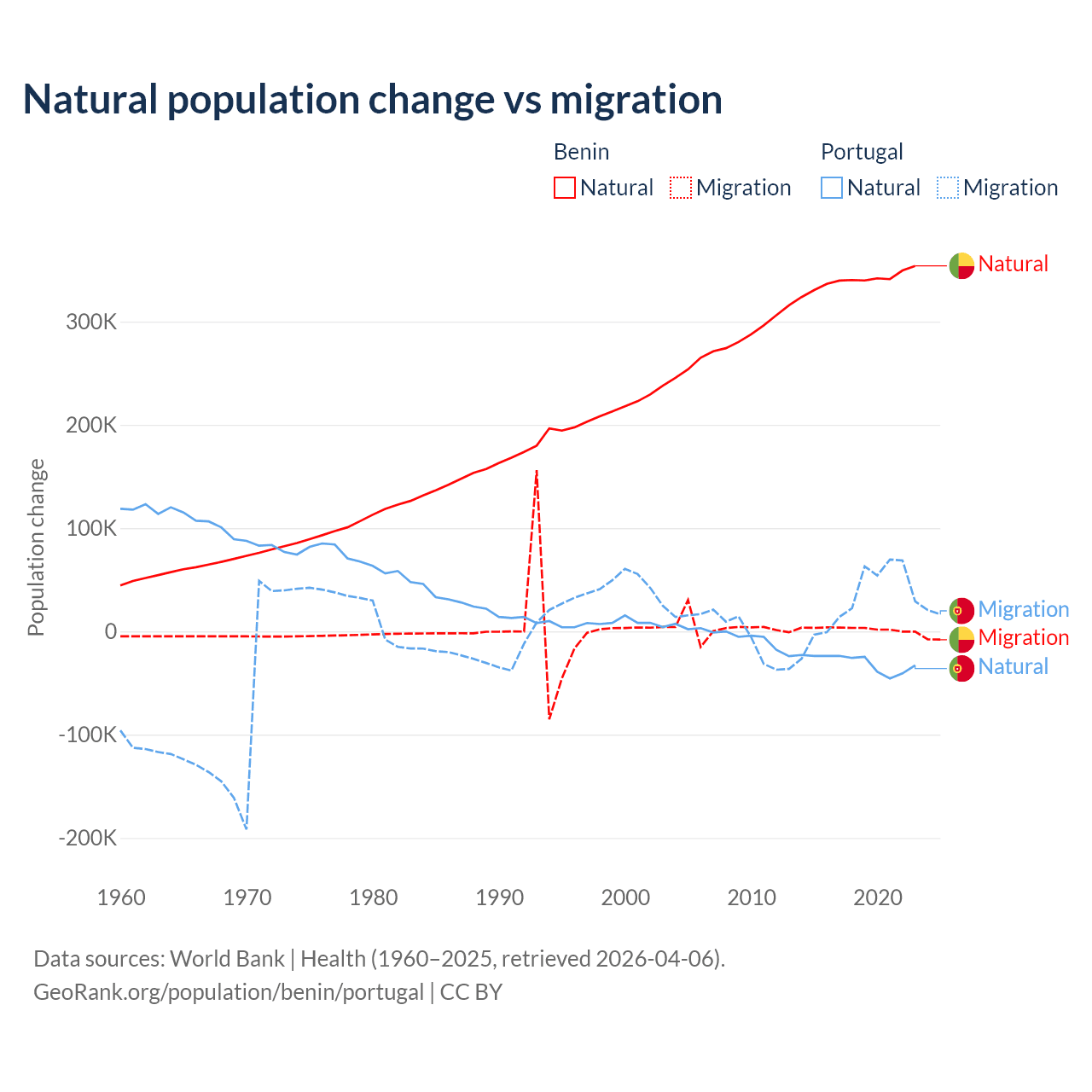 Over the last 10 years, 99.3% of the population change in Benin is from natural causes (a gain of 3,397,218 people) and 0.71% is from migration (a gain of 24,401 people). In Portugal 51% is from natural causes (a loss of 302,748 people) and 49% is from migration (a gain of 290,554 people).