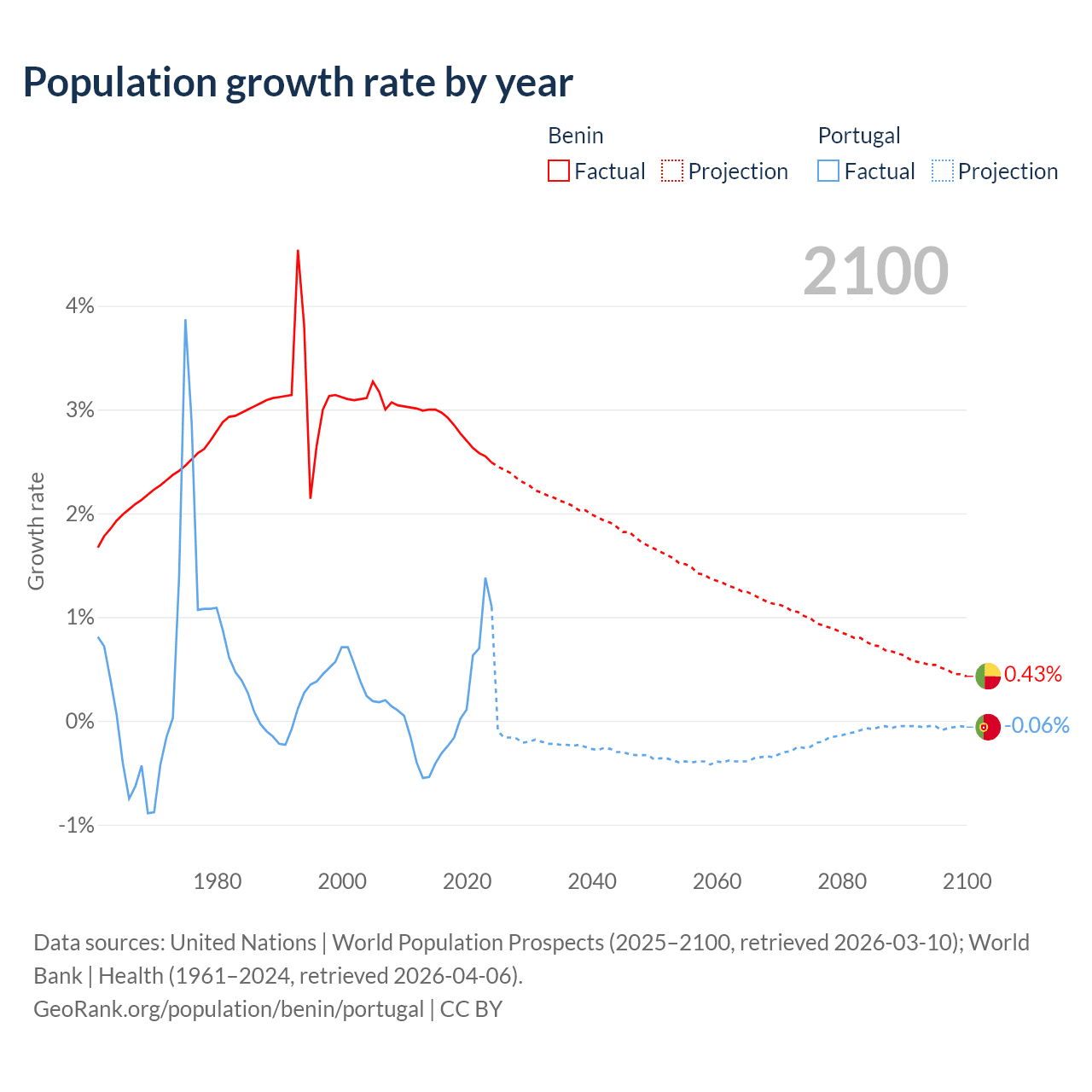 - For the last 10 years, Benin has had an average growth rate of +2.77% per year vs +0.21% in Portugal.