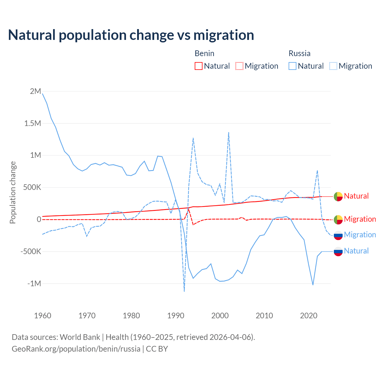 Over the last 10 years, 99.3% of the population change in Benin is from natural causes (a gain of 3,397,218 people) and 0.71% is from migration (a gain of 24,401 people). In Russia 48.6% is from natural causes (a loss of 3,416,377 people) and 51.4% is from migration (a gain of 3,611,826 people).