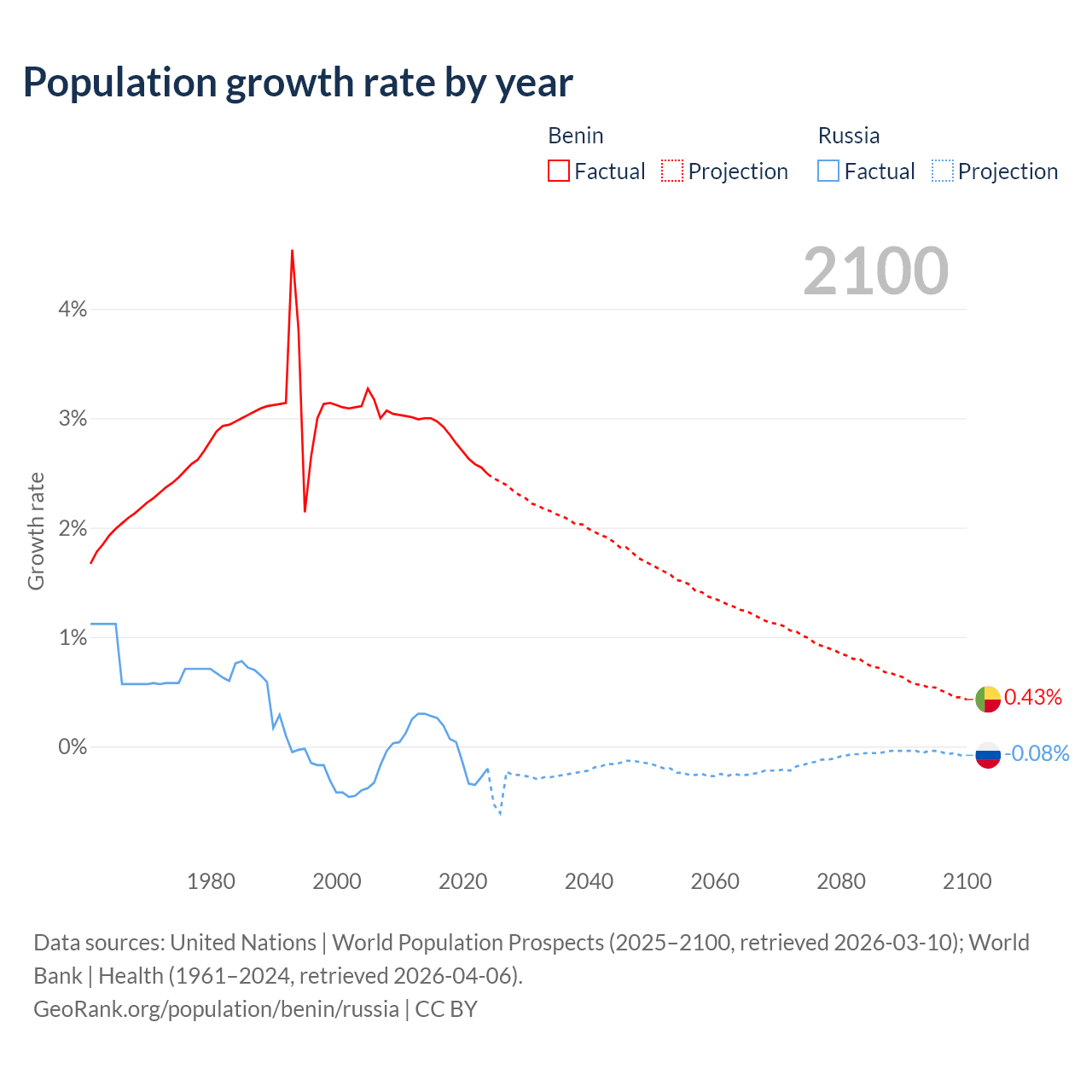- For the last 10 years, Benin has had an average growth rate of +2.77% per year vs -0.02% in Russia.