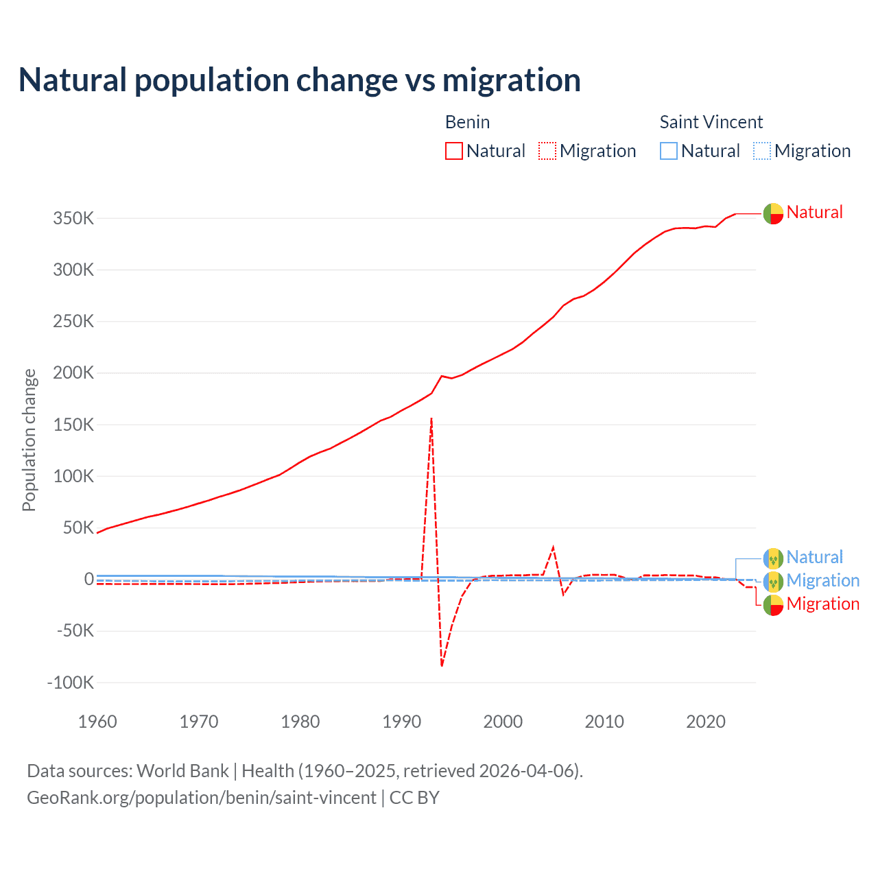 Over the last 10 years, 99.3% of the population change in Benin is from natural causes (a gain of 3,397,218 people) and 0.71% is from migration (a gain of 24,401 people). In Saint Vincent 21.2% is from natural causes (a gain of 2,525 people) and 78.8% is from migration (a loss of 9,393 people).