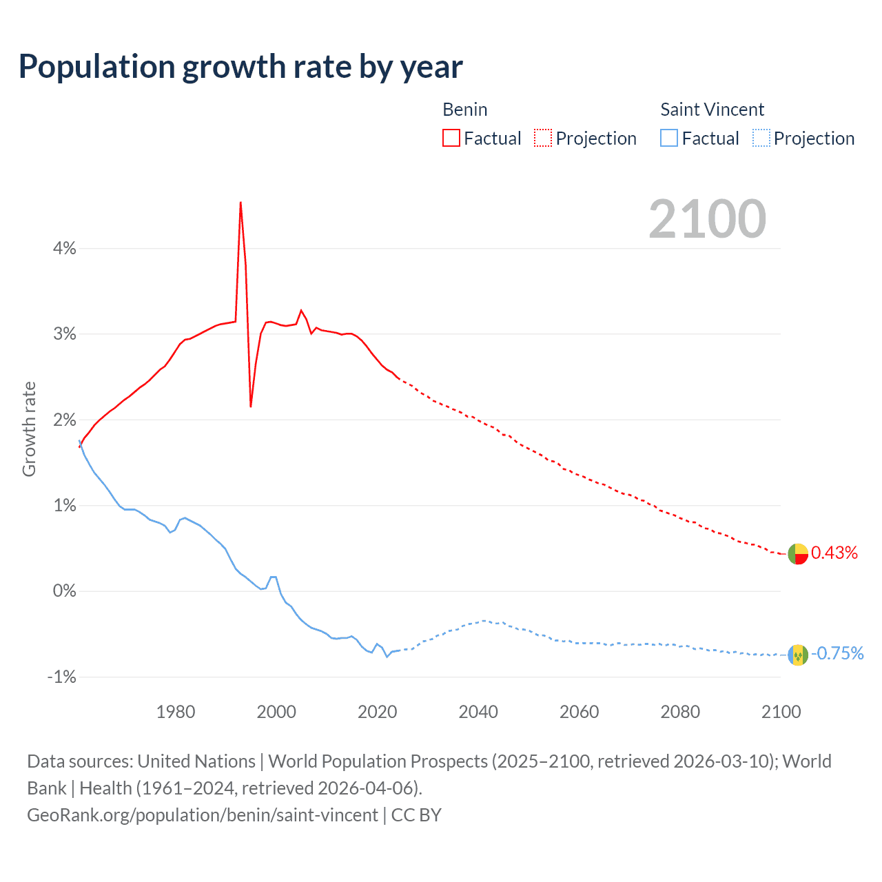 - For the last 10 years, Benin has had an average growth rate of +2.77% per year vs -0.65% in Saint Vincent.