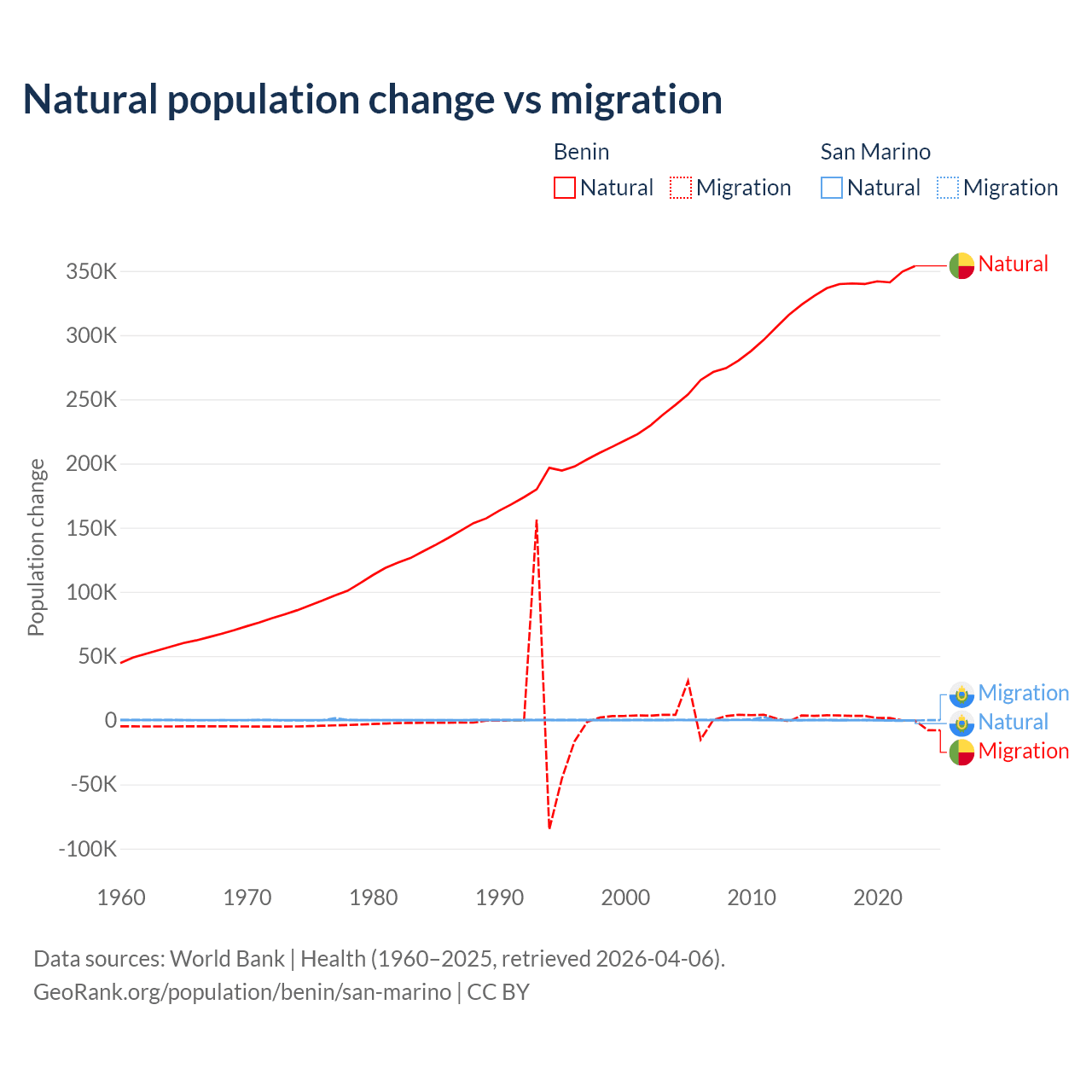 Over the last 10 years, 99.3% of the population change in Benin is from natural causes (a gain of 3,397,218 people) and 0.71% is from migration (a gain of 24,401 people). In San Marino 40.9% is from natural causes (a loss of 358 people) and 59.1% is from migration (a gain of 517 people).