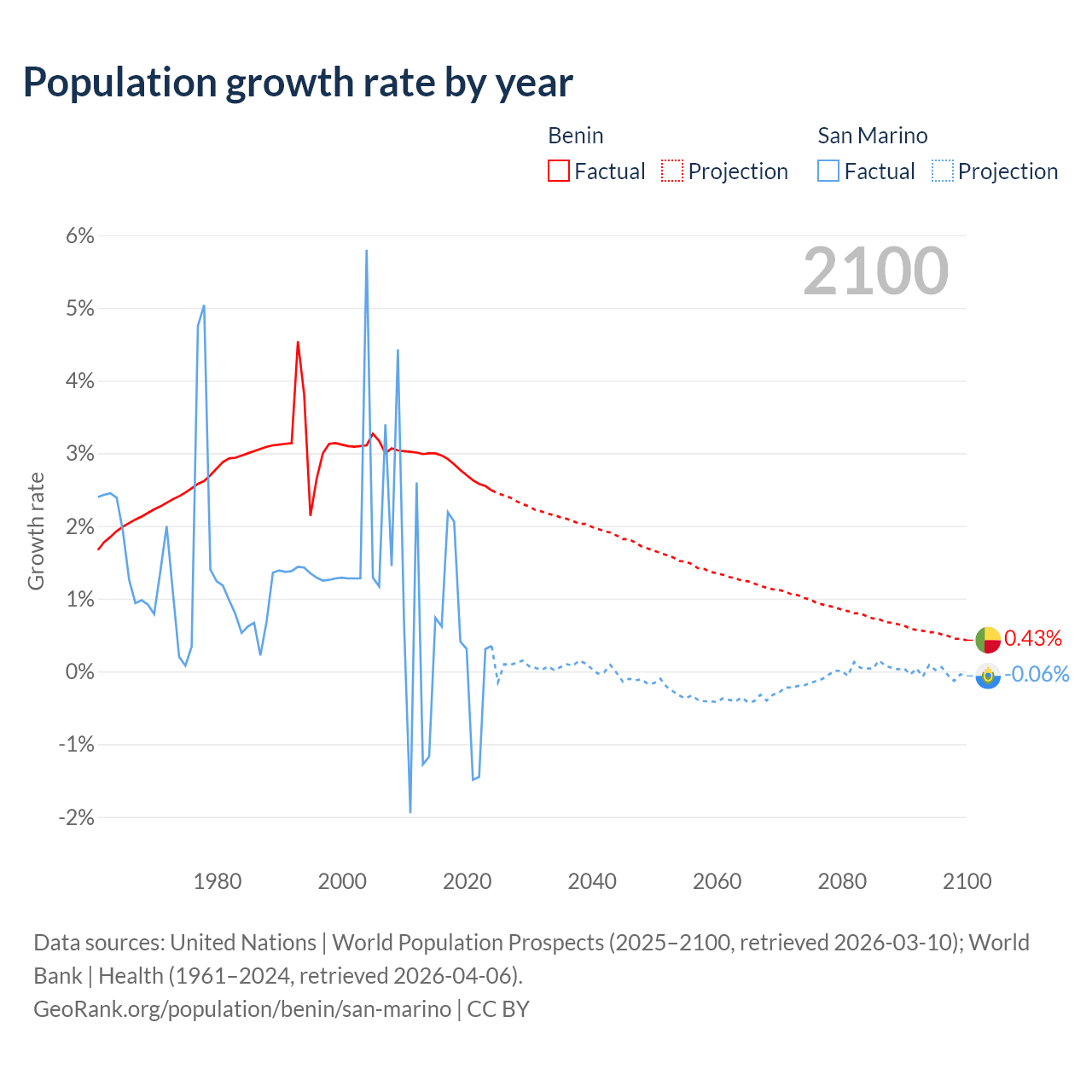 - For the last 10 years, Benin has had an average growth rate of +2.77% per year vs +0.26% in San Marino.
