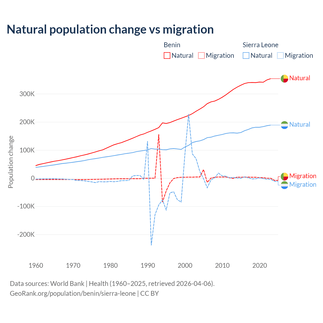 Over the last 10 years, 99.3% of the population change in Benin is from natural causes (a gain of 3,397,218 people) and 0.71% is from migration (a gain of 24,401 people). In Sierra Leone 99.6% is from natural causes (a gain of 1,764,049 people) and 0.41% is from migration (a loss of 7,211 people).